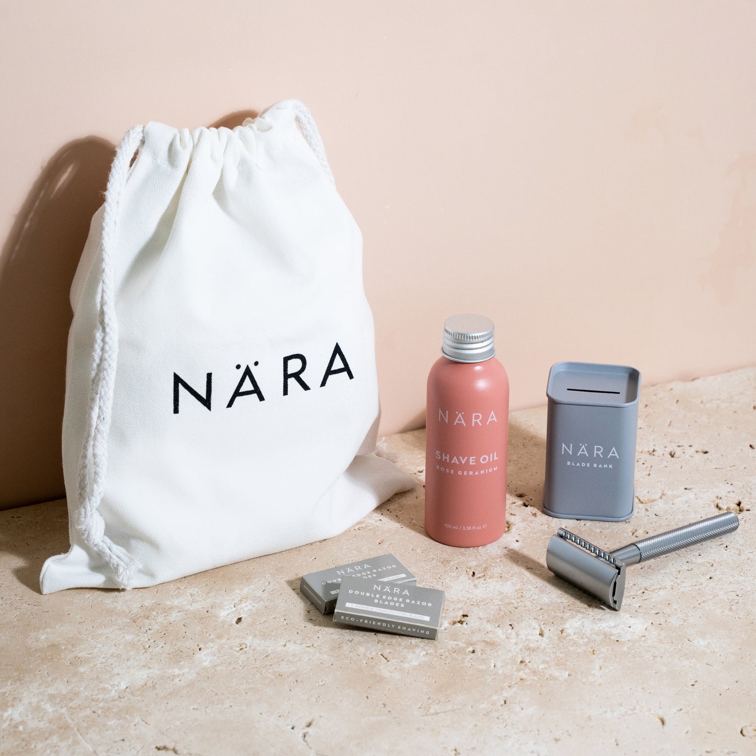 Our eco-friendly shave kit includes a beautifully designed, reusable safety razor, luxurious shave oil that nourishes your skin, quality stainless steel razor blades, reusable tote bag and a blade bank to safely dispose of used blades.